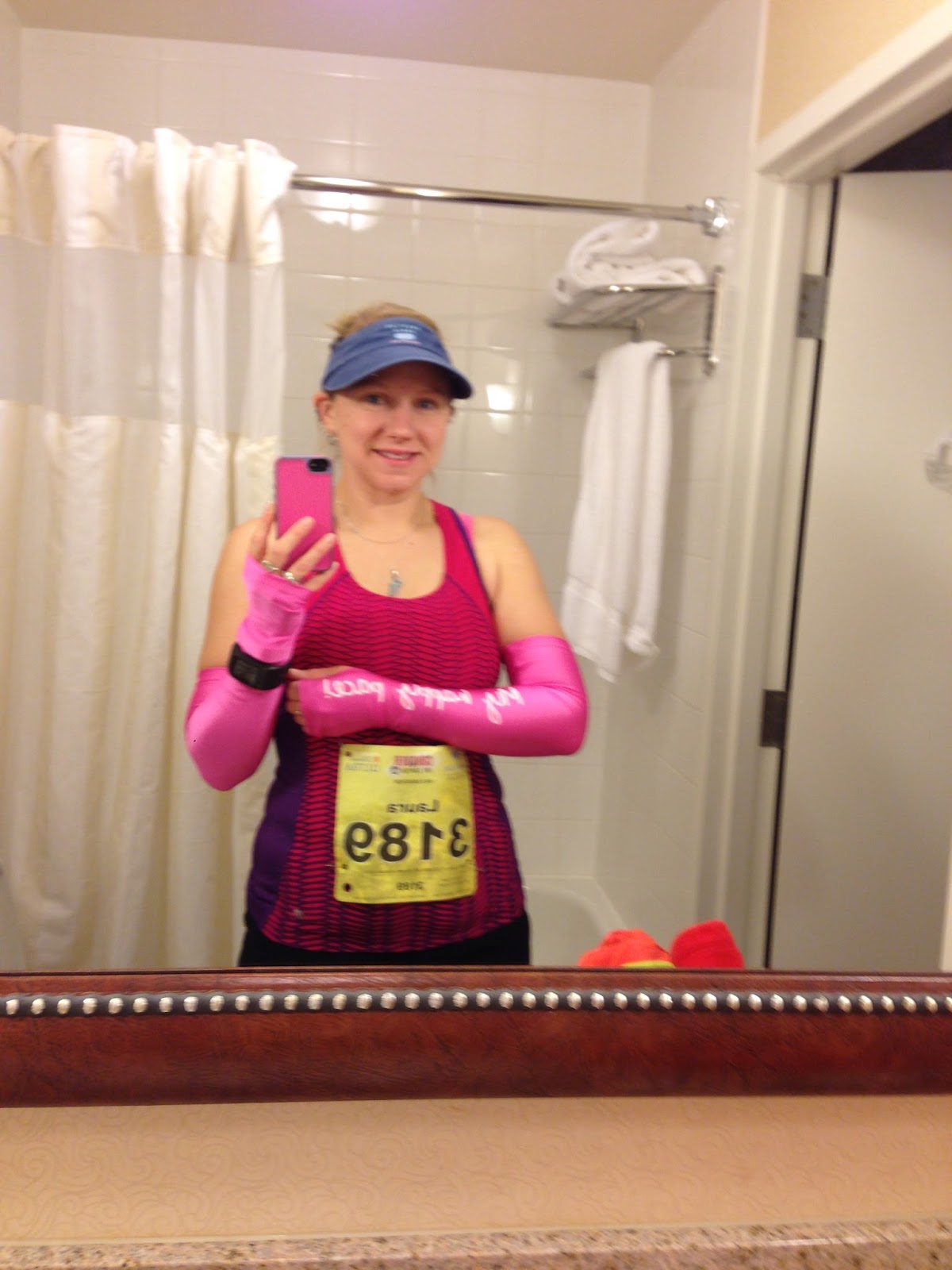 The next morning, I got up before everyone else to get ready. I wanted them to sleep as much as possible so that they would behave for Daddy! HA! I kept checking the weather like crazy because the forecast was calling for rain all day. It hadn't started yet, but it looked like it was coming. Not thrilled, but I knew I was going to run and do my best regardless! I had packed umbrellas and plastic bags in the event of the rain so Jay and the kids would be covered, literally!